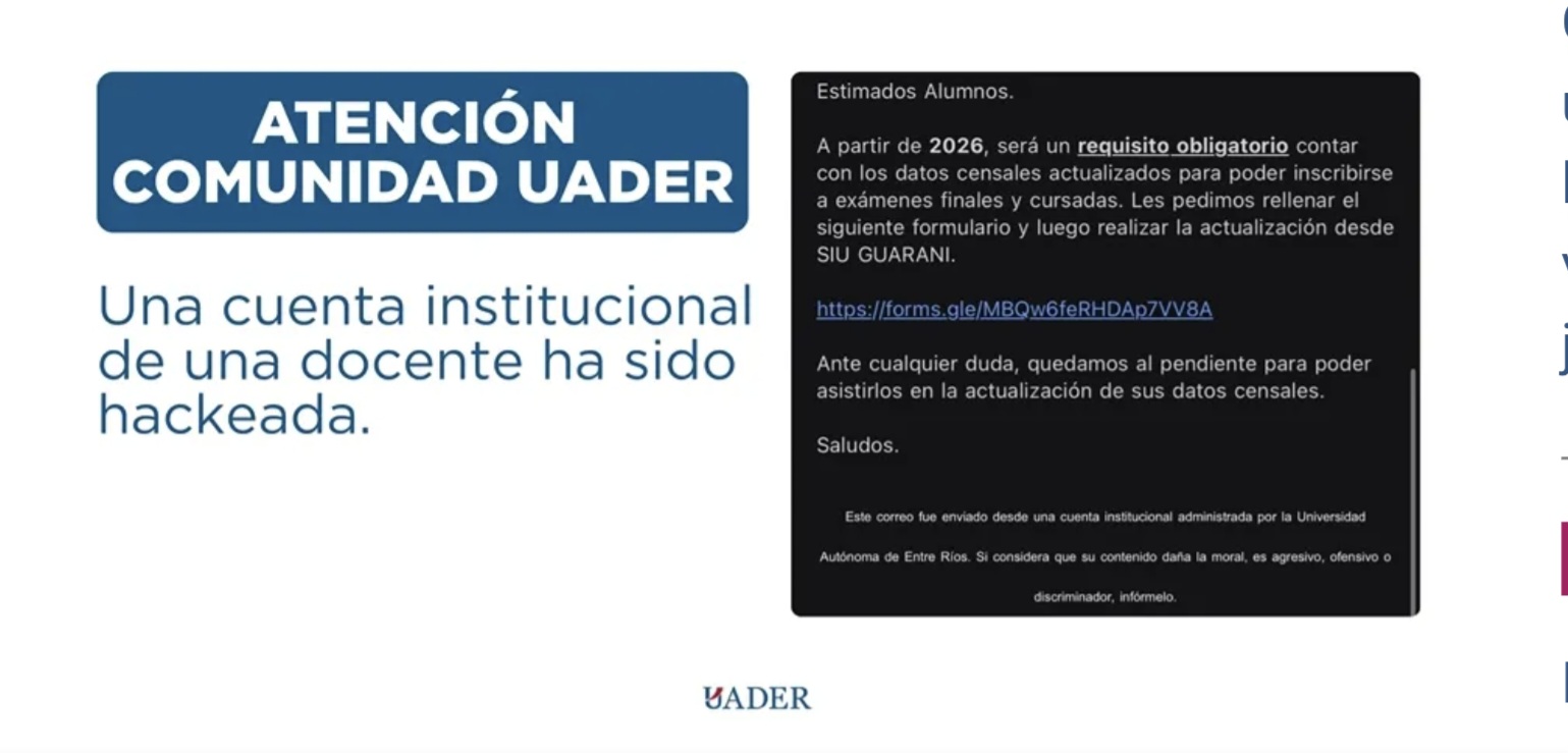 La Universidad Autónoma de Entre Ríos (UADER) informa a la comunidad universitaria que la cuenta de correo electrónico de una docente de la institución ha sido vulnerada, y desde la misma se están enviando mensajes a estudiantes solicitando la actualización de supuestos “datos censales” mediante un formulario externo.