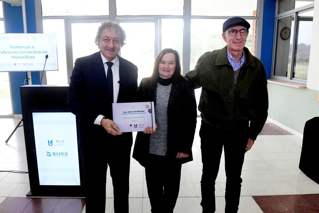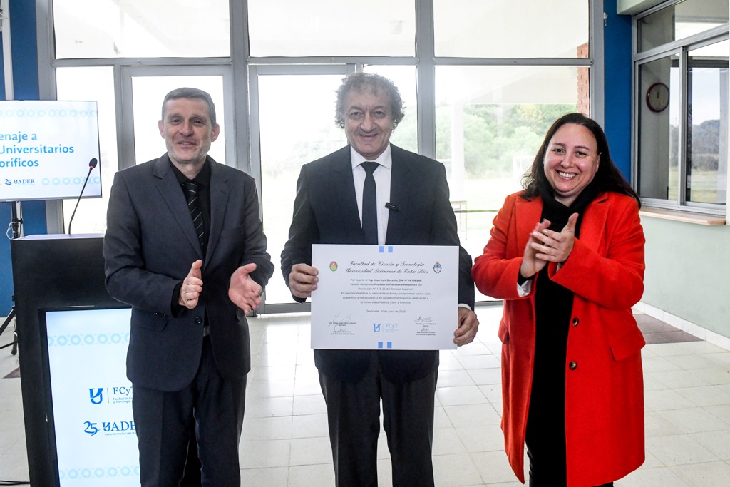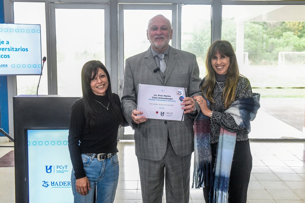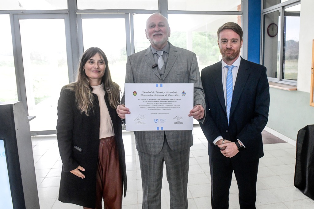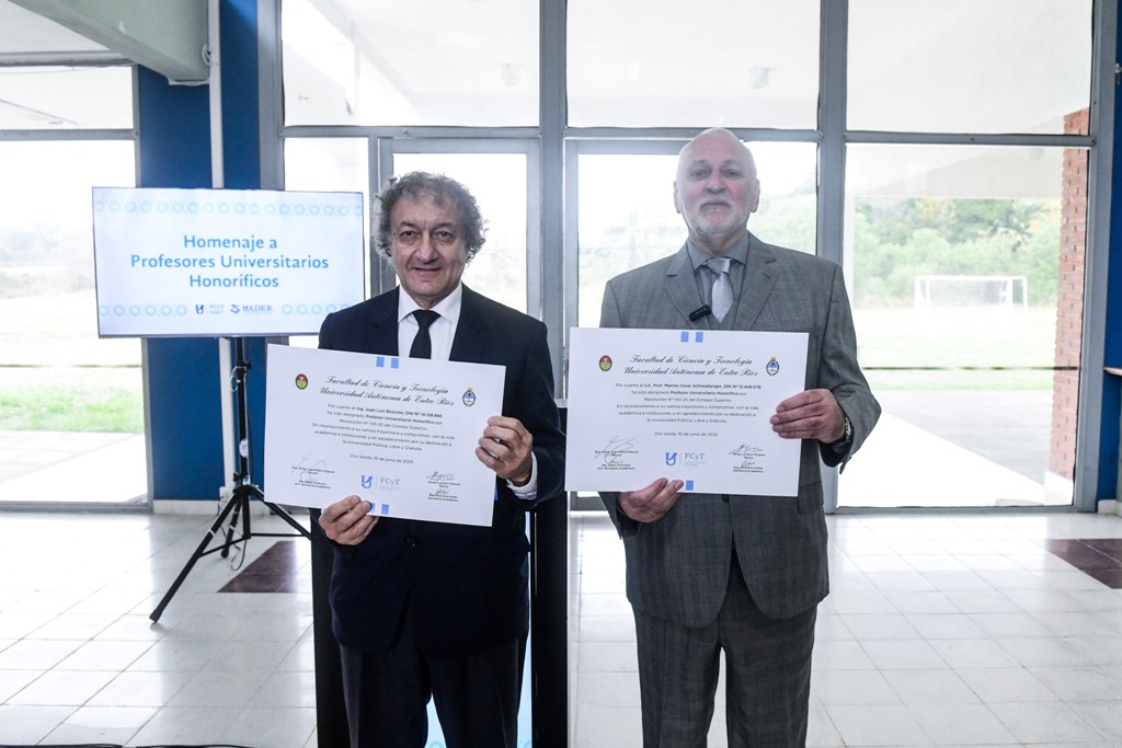 En un emotivo acto celebrado el martes 10 de junio en la Sede Oro Verde, la Facultad de Ciencia y Tecnología (FCyT) de la Universidad Autónoma de Entre Ríos (UADER) rindió homenaje a dos referentes indiscutibles de su historia institucional: el Prof. Marino Schneeberger y el Ing. Juan Luis Bózzolo, quienes recibieron el título de Profesores Universitarios Honoríficos.