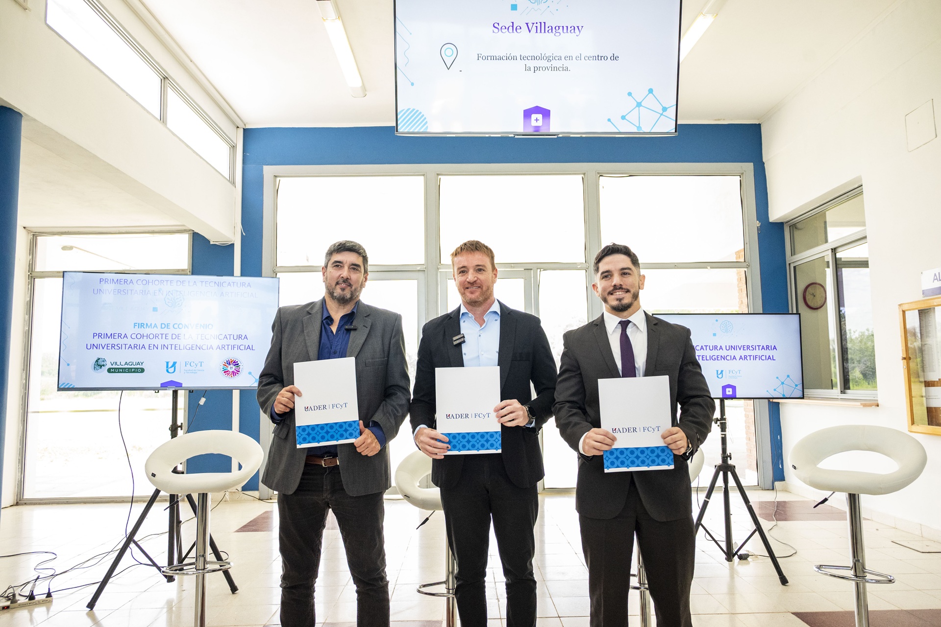 El acto se desarrolló este martes 11 de noviembre en la Sede Central Oro Verde de la FCyT, donde el decano, Abog. Esp. Juan Pablo Filipuzzi, firmó el convenio que hace posible el dictado de la nueva carrera con el intendente de Villaguay, Adrián Fuertes; y la Asociación Civil Cooperadora de la FCyT, a través de su presidente, Franco Virjan.