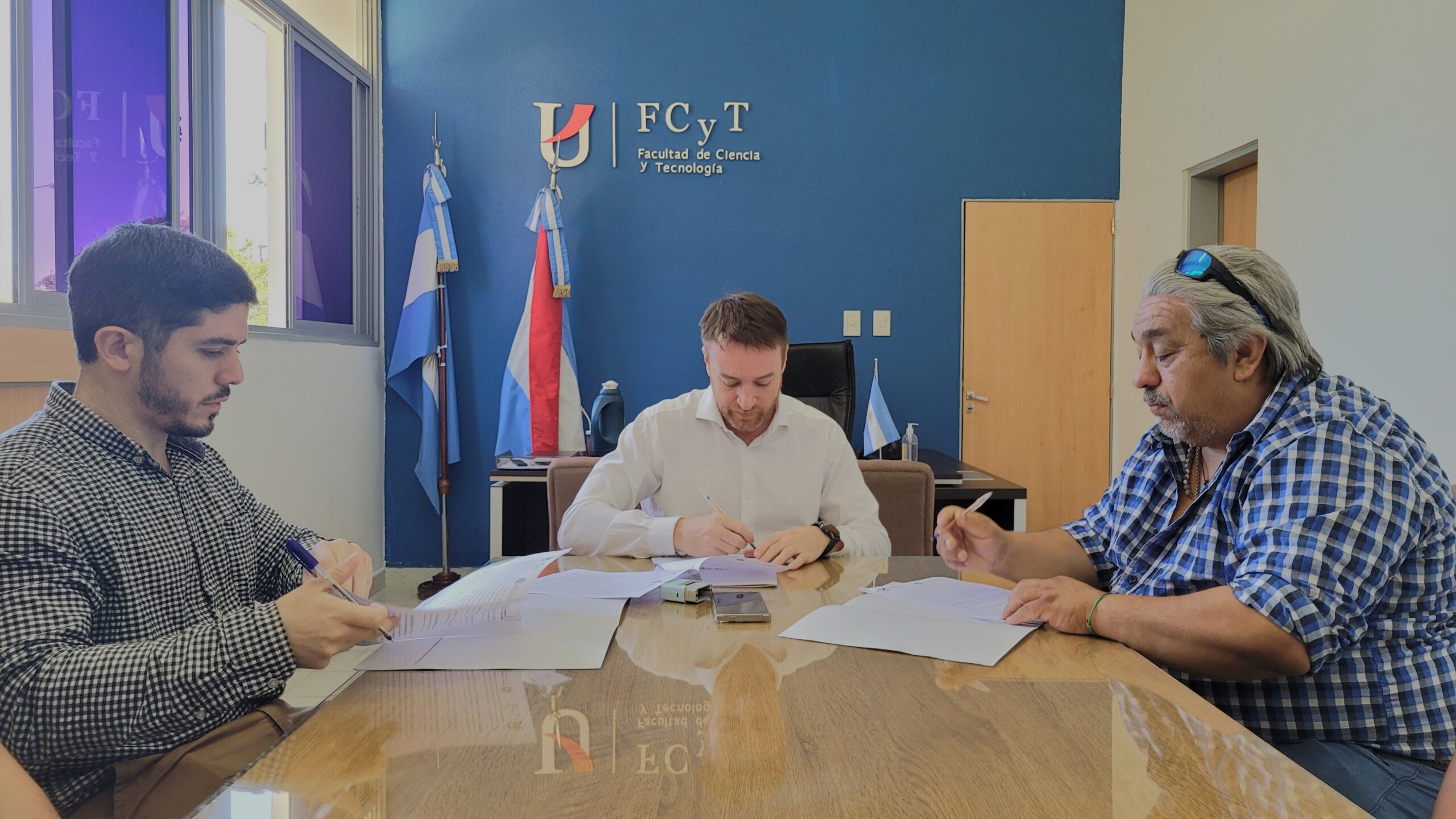 La firma estuvo a cargo del Decano de la FCyT, Esp. Abog. Juan Pablo Filipuzzi; el secretario general de ATE seccional Federal, Martín Olier; y el presidente de la Asociación Cooperadora FCyT, Abg. Franco Virján.