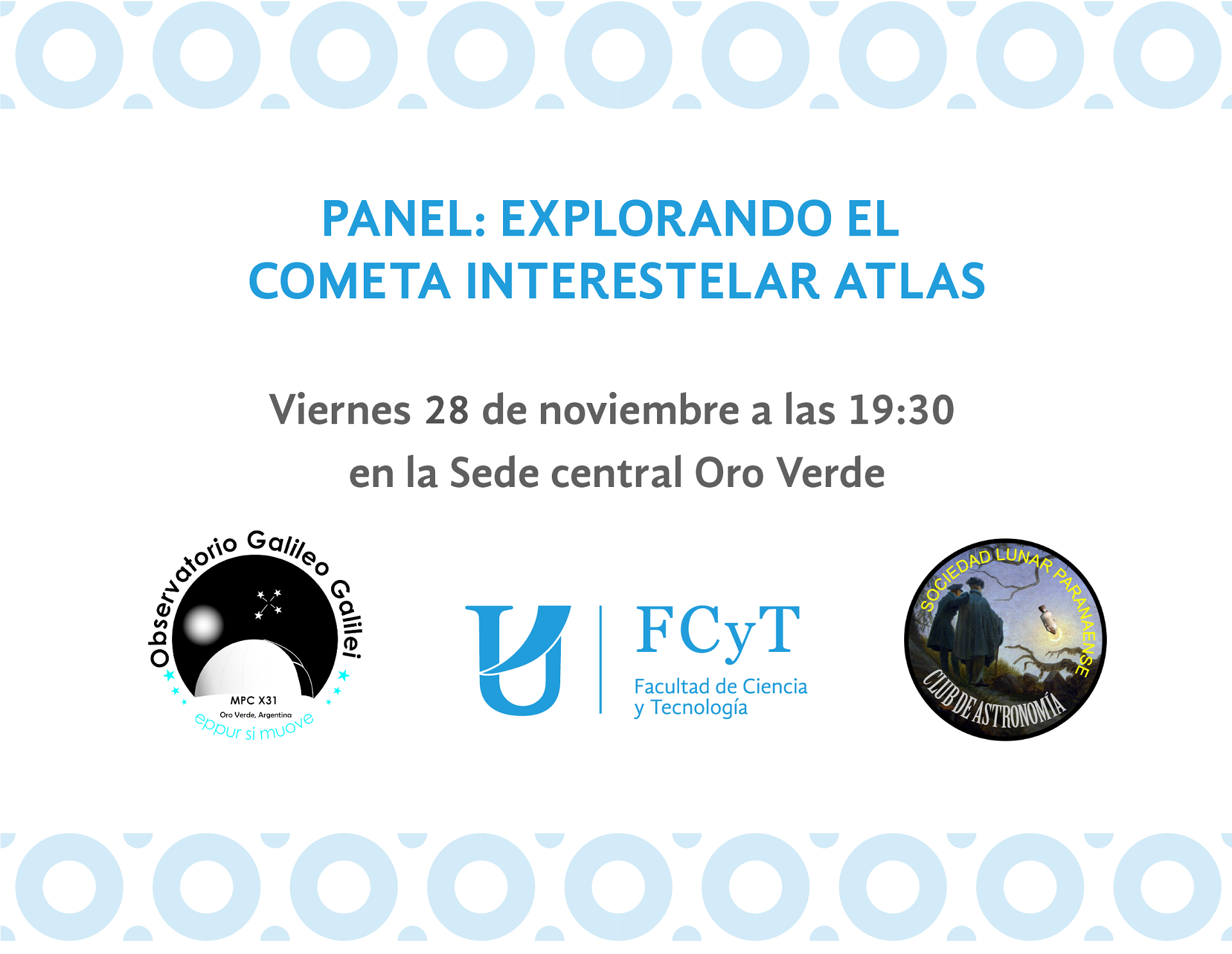 El viernes 28 de noviembre a las 19:30 en la Sede Central Oro Verde, se llevará a cabo el panel “Explorando el cometa interestelar ATLAS”, una propuesta abierta al público y con entrada libre y gratuita. La actividad contará con las disertaciones de la Prof. Erica Reisenauer, docente de la Cátedra Astrofísica del Profesorado en Física, y el Prof. Alberto Anunziato, director de la Sociedad Lunar Paranaense.